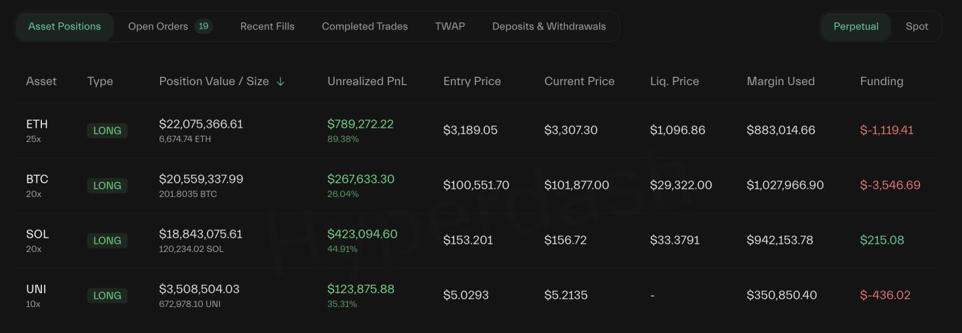 HyperDash 데이터에 따르면 그의 오픈 포지션은 현재 약 160만 달러의 미실현 수익을 창출하고 있습니다. 이 암호화폐 고래의 승률은 73.73%입니다.