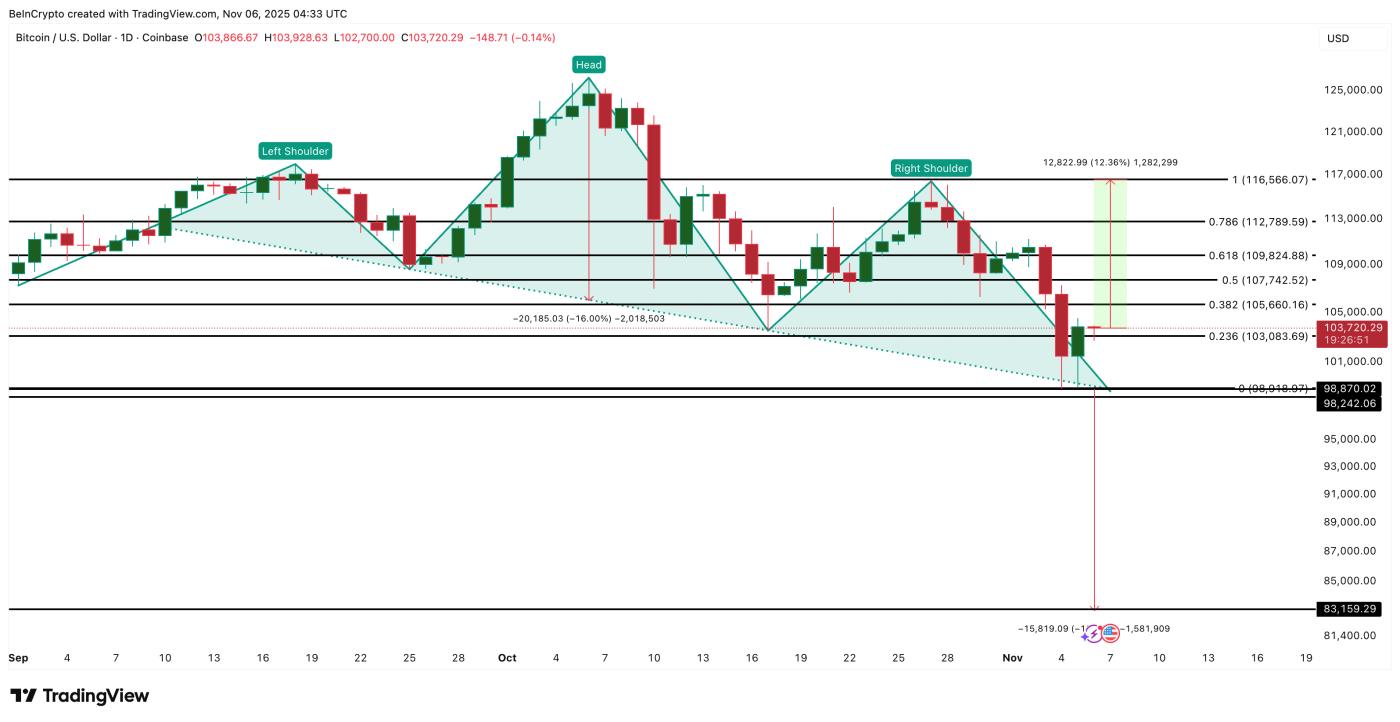 하지만 10만 3천 달러가 무너지면 비트코인은 9만 8천 9백 달러로 다시 떨어질 위험이 있습니다. 10만 3천 달러 아래로 마감될 경우, 네크라인 붕괴가 발생할 수 있습니다. 그렇게 되면 비트코인(BTC) 가격은 해당 패턴의 예상 하락 목표인 8만 3천 1백 달러까지 상승할 수 있습니다.