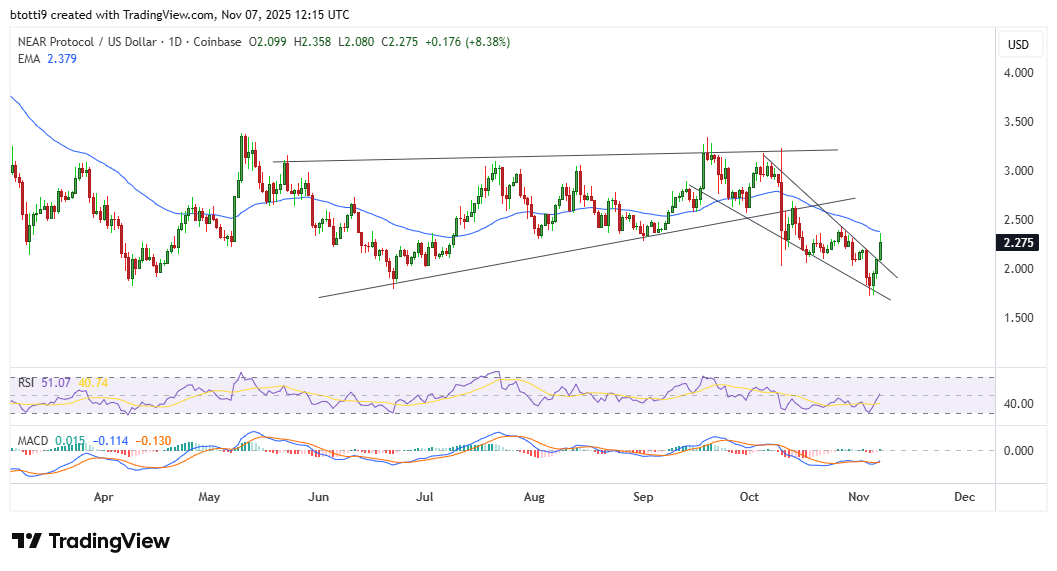 NEAR은 현재 2.27달러에 거래되고 있으며, 이는 10월 중순 이후 최고가를 기록한 일중 최고가 2.34달러보다 약간 낮은 수준입니다.