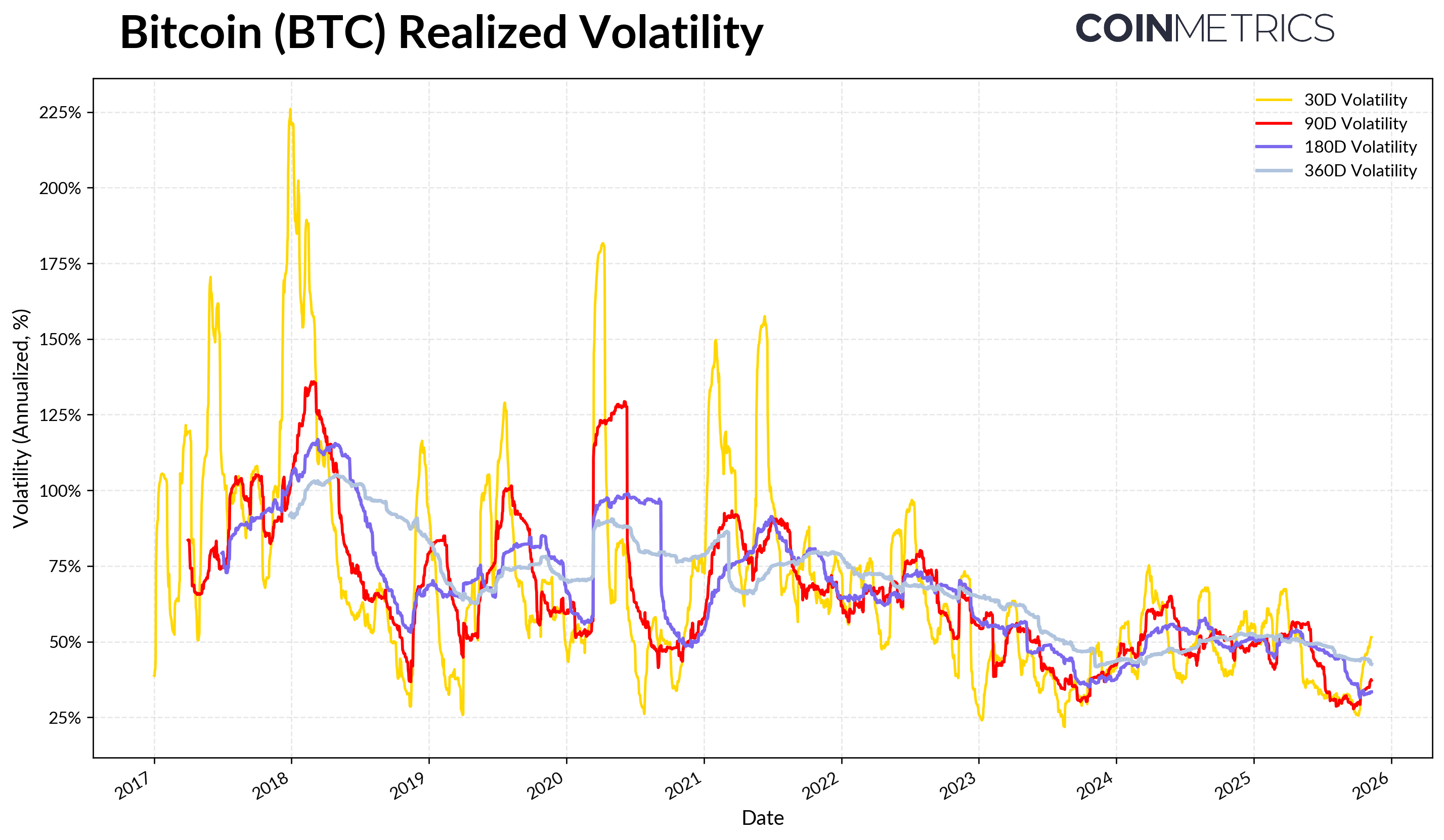 실현된 변동성은 지속적으로 안정화되고 있으며, 이는 기관 수요와 장기 사이클 리듬으로 정의되는 보다 성숙한 시장 구조를 나타냅니다.
