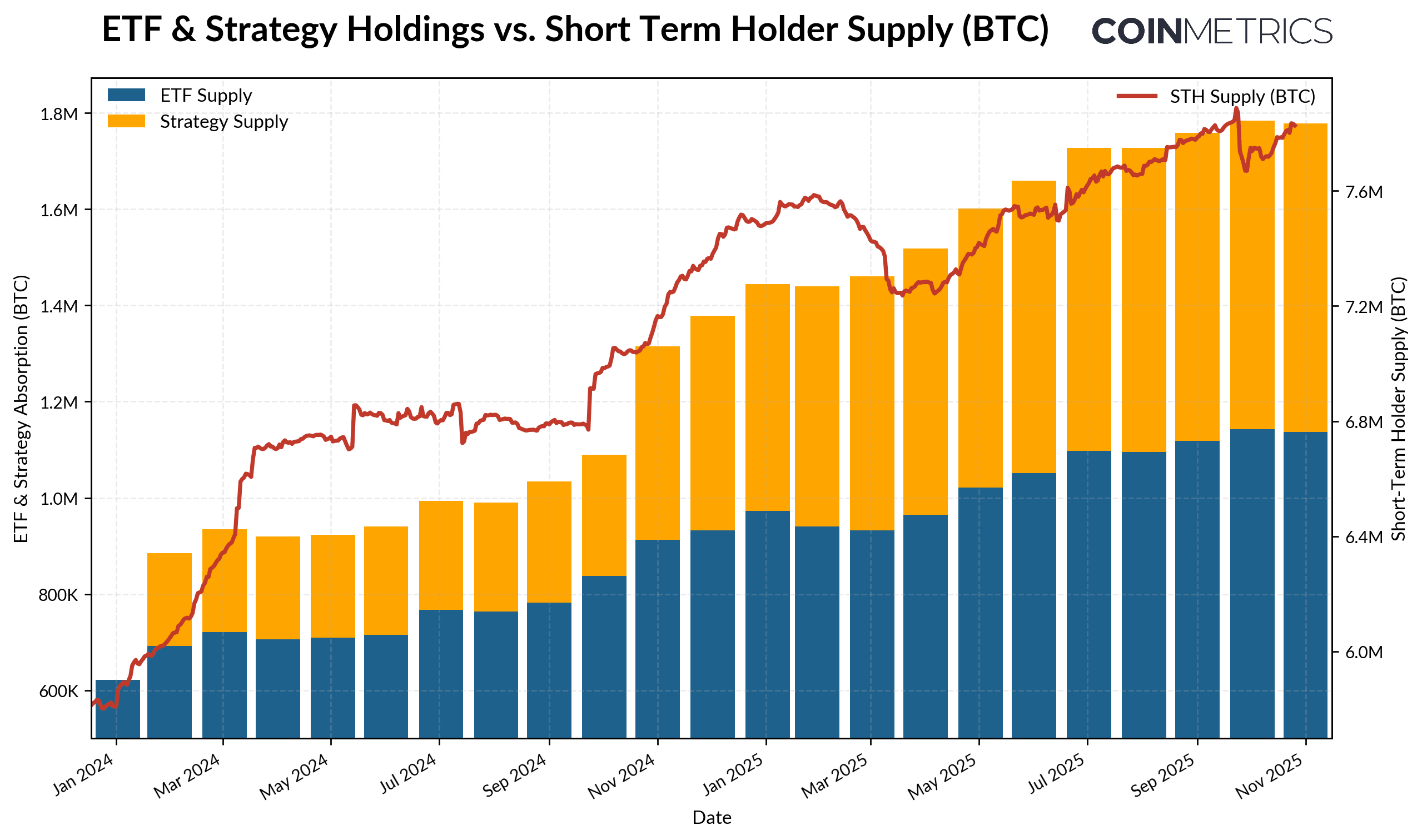 2025년 11월 기준, 지난 1년 동안 783만 비트코인(BTC) 활성화되어 2024년 초 586만 비트코인(BTC) 에서 약 34% 증가했습니다. 이는 이전에 휴면 상태였던 코인들이 다시 유통되면서 나타난 현상입니다. 같은 기간 동안 현물 비트코인 ETF와 Strategy의 트레져리 보유량은 약 60만 비트코인(BTC) 에서 190만 비트코인(BTC) 로 증가하여 단기 홀더 공급량 순증가분의 거의 90%를 흡수했습니다. 이러한 자산들을 합치면 현재 전체 단기 홀더 공급량의 약 23%를 차지합니다.
