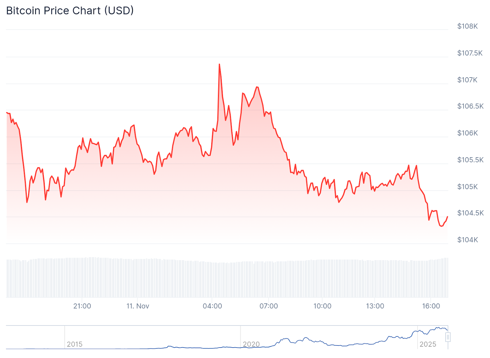 11월 11일 화요일 암호화폐 시장은 하락세를 보였습니다. 비트코인은 10만 4천 달러 바로 위에 머물렀고, 시가총액 기준 상위 알트코인 대부분은 오늘 소폭 하락했습니다. 의회가 기록적인 장기 정부 셧다운을 종식시키기 위한 진전을 보이고 있다는 소식에 어제 상승세를 보인 후, 시장은 하락했습니다.