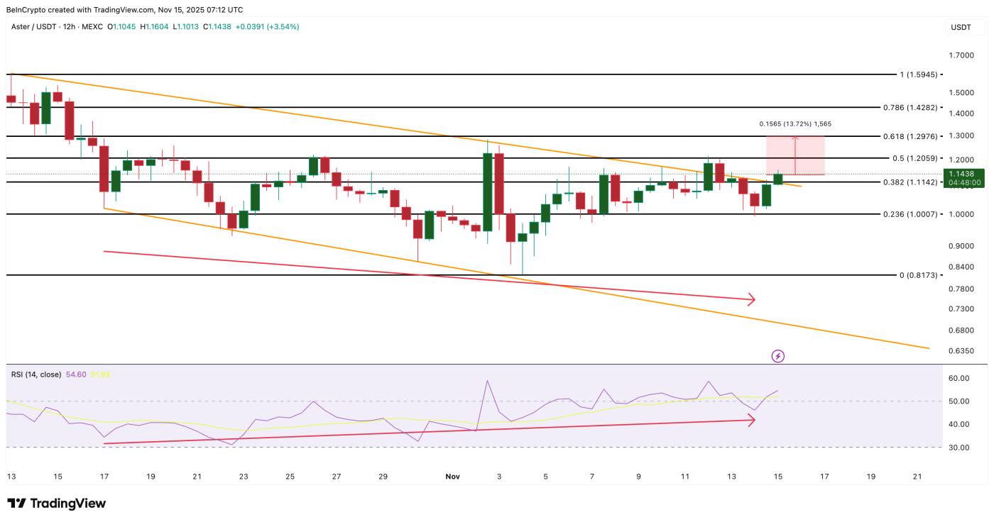 애스터 홀더: 난센(Nansen)차트는 이러한 지갑들의 움직임을 뒷받침합니다. ASTER 가격은 12시간 차트에서 하락 채널을 이탈하여 약세 추세가 약해지고 있음을 시사합니다. 또한 10월 17일과 11월 14일 사이에는 뚜렷한 표준 강세 RSI 다이버전스가 나타났습니다.