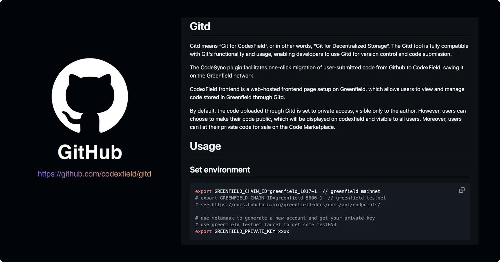 Gitd는 GitHub 및 GitLab과 동일한 방식으로 작동합니다. 복제, 풀, 푸시, 브랜치, 병합과 같은 작업은 마이그레이션 비용이 필요하지 않으므로 제작자는 익숙한 방식으로 협업하고 커밋할 수 있습니다. 모든 콘텐츠는 궁극적으로 탈중앙화 데이터 네트워크인 Greenfield에 저장되며, 각 커밋은 검증 가능한 온체인 레코드를 생성합니다. 이는 중앙 집중식 플랫폼에 비해 동결, 추적 가능, 검열 불가 등의 특성을 자연스럽게 갖추고 있습니다.