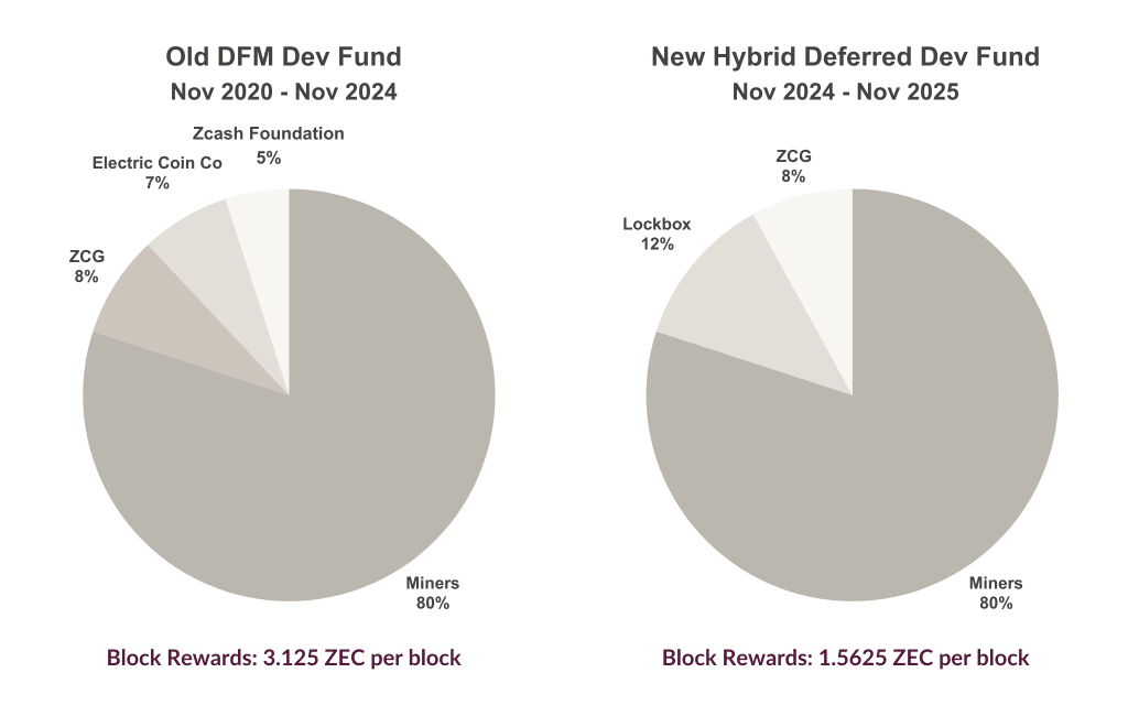 지캐시(Zcash) 여러 차례 의 네트워크 업그레이드를 거쳤으며, 가장 최신 업그레이드는 2024년 11월 NU6 입니다. NU6는 지캐시(Zcash) 블록 보조금에서 할당된 개발 기금의 구조를 변경하여 블록 보상의 80%를 채굴자 에게, 8%를 생태계 팀에 자금을 지원하는 지캐시(Zcash) 커뮤니티 보조금(ZCG)에, 12%를 토큰 보유자가 관리하는 지연 자금 풀인 프로토콜 내 "록박스"에 할당했습니다.