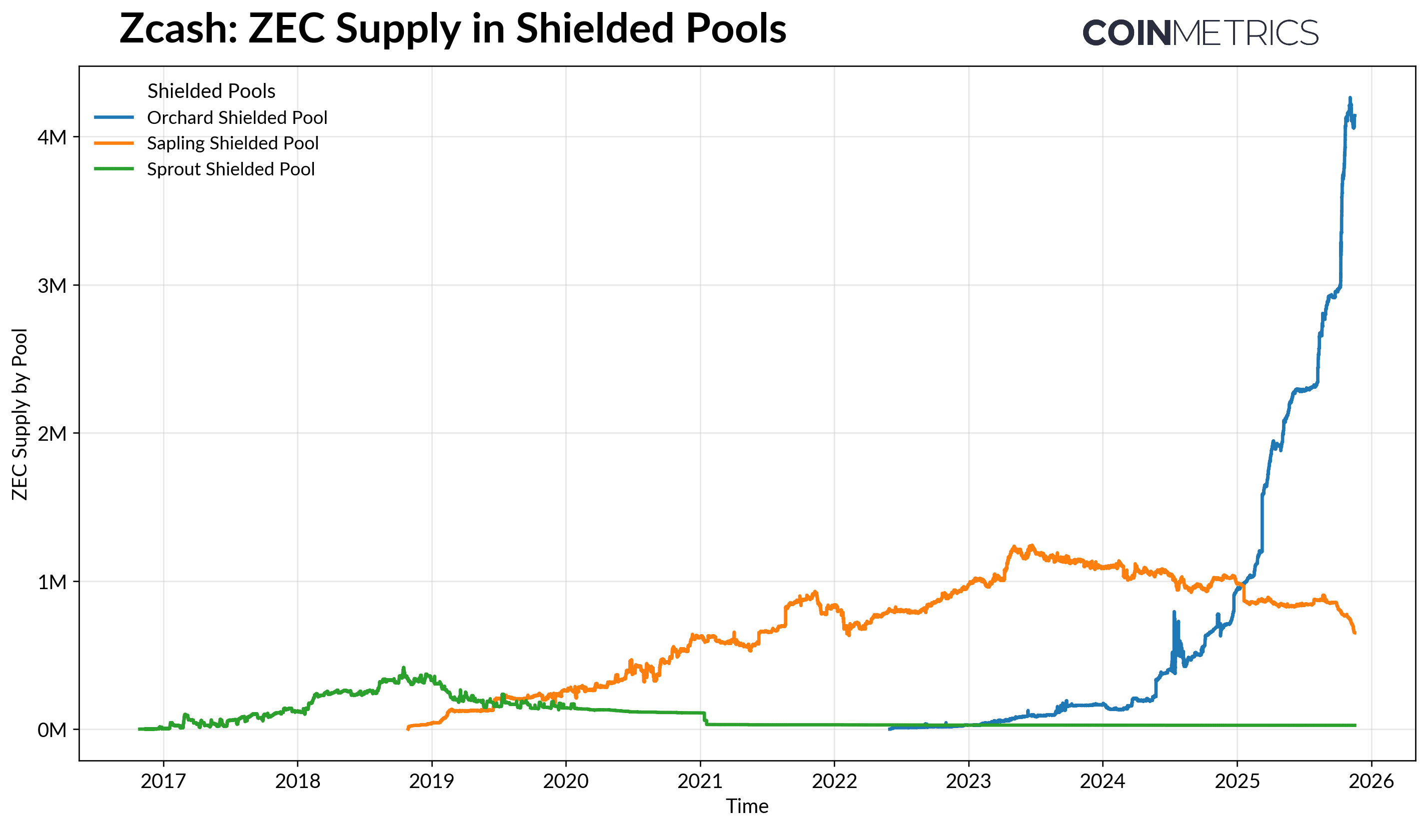 보호된 공급은 490만 지캐시(ZEC) (공급량의 약 30%)로 증가했는데, 이는 완전한 비공개 거래보다는 부분적으로 보호된 흐름의 증가에 따른 것입니다.