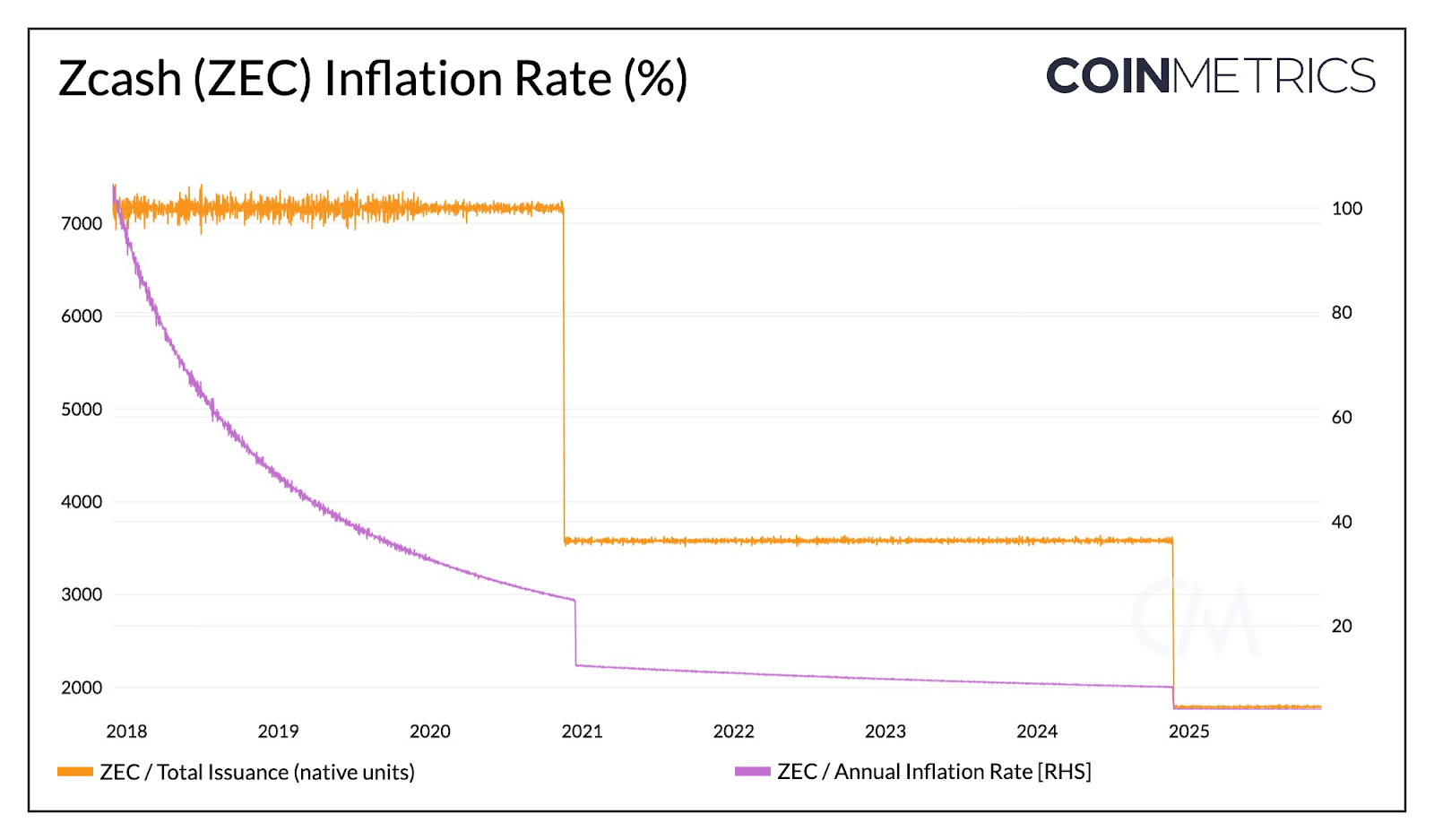 2024년 11월에 있었던 가장 최근의 반감기에는 블록 보상 블록 당 1.5625 지캐시(ZEC) 로 줄어들었고, 이로 인해 연간 인플레이션율이 약 4%가 되었습니다.