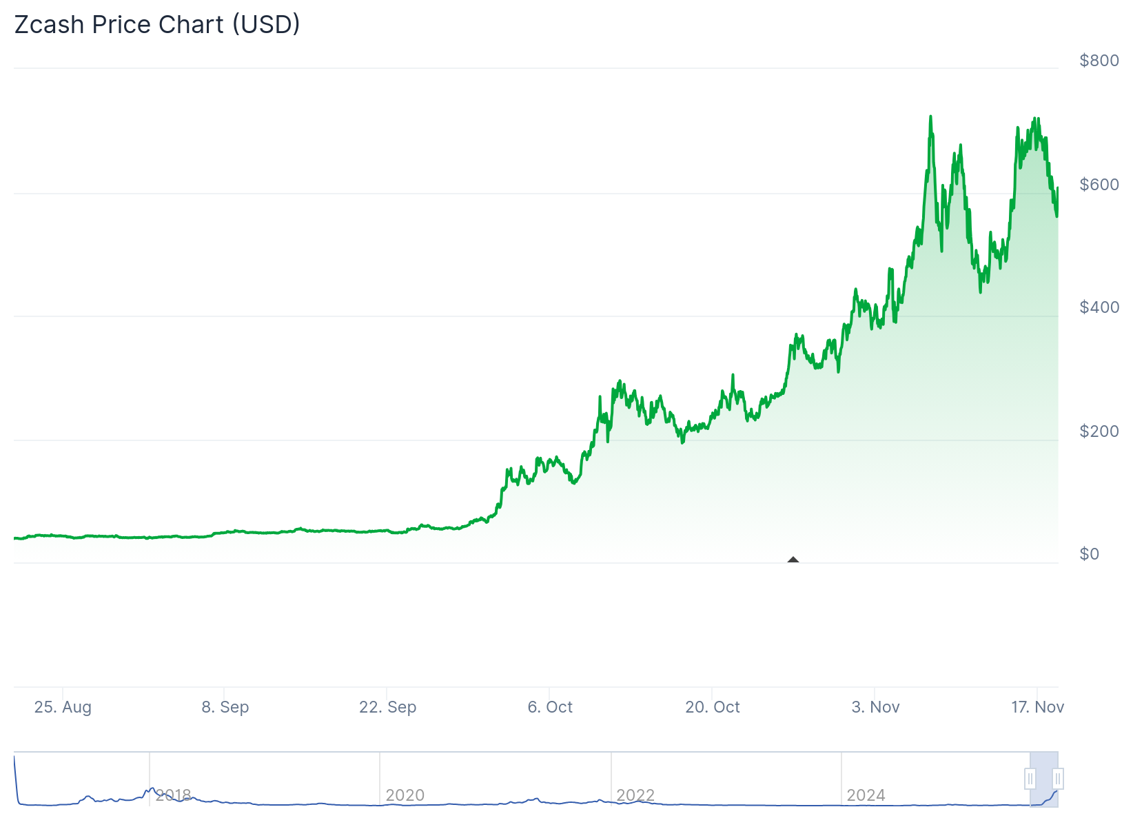 한편, The Defiant의 가격 추적 페이지 에 따르면 지캐시(ZEC) 당일 10% 이상 하락하여 600달러 선에서 거래되고 있습니다. 이러한 조정에도 불구하고, ZEC는 올해 9월 말 시작된 급등세 이후 지난 3개월 동안 1,400% 이상 상승했습니다. ZEC는 55달러에서 720달러 이상으로 급등했는데, 이는 지캐시(ZEC) 보유자들이 2018년 이후 처음 있는 일입니다.