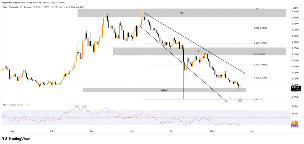 - ENA는 하락 채널 내에서 거래되고 있으며, 압력으로 인해 토큰이 지지선 쪽으로 움직이고 있습니다.