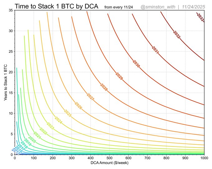Lines represent how long it takes to stack 1 Bitcoin if you start that year.