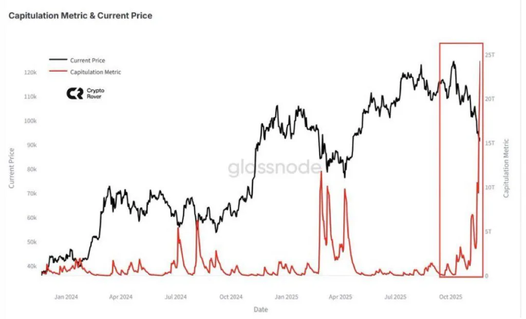 비트코인은 전부 매도(Capitulation) 지표가 25T에 근접하면서 심각한 스트레스 구간에 진입했습니다. 이는 2020년 초 이후 최고 수준입니다. 가격은 110K 구간에서 90K 구간으로 급락했으며, 차트에서는 2024년과 2025년에 걸쳐 반복적으로 전부 매도(Capitulation) 급등이 나타났습니다.