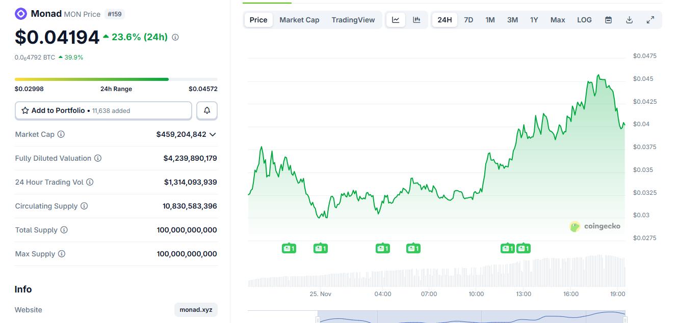 매수자들은 빠르게 물량을 흡수했습니다. 24시간 만에 MON은 $0.03~0.035 근처에서 거래되었고, 현재는 $0.04 정도로 거래되고 있습니다. 이는 공개 매각가 $0.025보다 50~70% 이상 높은 수준입니다 .