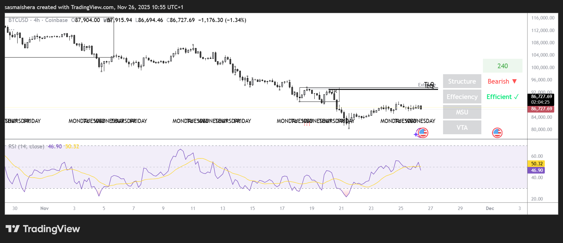 - 비트코인(BTC) 지난 24시간 동안 1% 미만으로 하락했으며 현재 87,000달러 이하에서 거래되고 있습니다.
