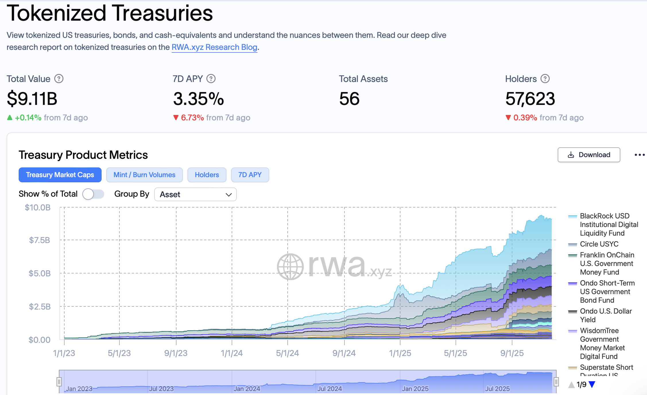미국 국채에 투자하는 토큰화된 머니 마켓 펀드는 2025년에 빠르게 확대되었습니다. RWA.xyz 데이터에 따르면 BlackRock의 온체인 머니 마켓 상품은 현재 23억 달러 규모의 토큰화된 자산을 보유하고 있는 반면, Franklin Templeton의 머니 마켓 펀드는 8억 2,600만 달러 이상의 자산을 보유하고 있습니다.