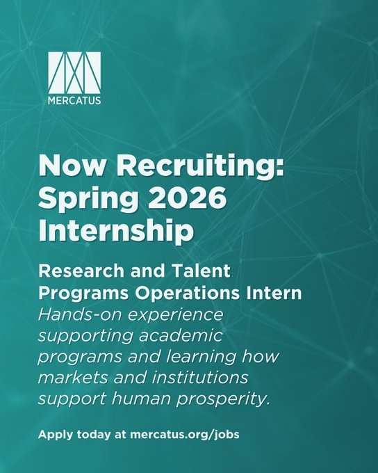 2026년 봄 연구 및 인재 프로그램 운영 인턴을 모집합니다. 이 인턴십은 학술 프로그램을 지원하는 실무 경험을 쌓고 시장과 기관이 인류의 번영을 어떻게 지원하는지 배울 수 있는 기회를 제공합니다. 자세히 알아보고 지원하세요 → mercatus.org/jobs