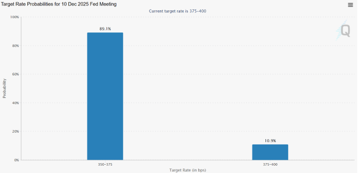 이 외에도 연방기금금리 인하에 대한 기대감도 커졌습니다. CME 그룹 지표에 따르면 연준이 금리를 25포인트 인하할 가능성은 약 89%입니다.