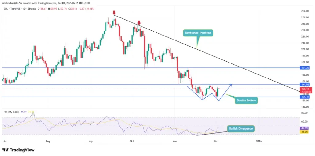 - 솔라나(Solana) 가격은 125달러 지지선에서 이중 바닥 반전 패턴을 형성합니다.