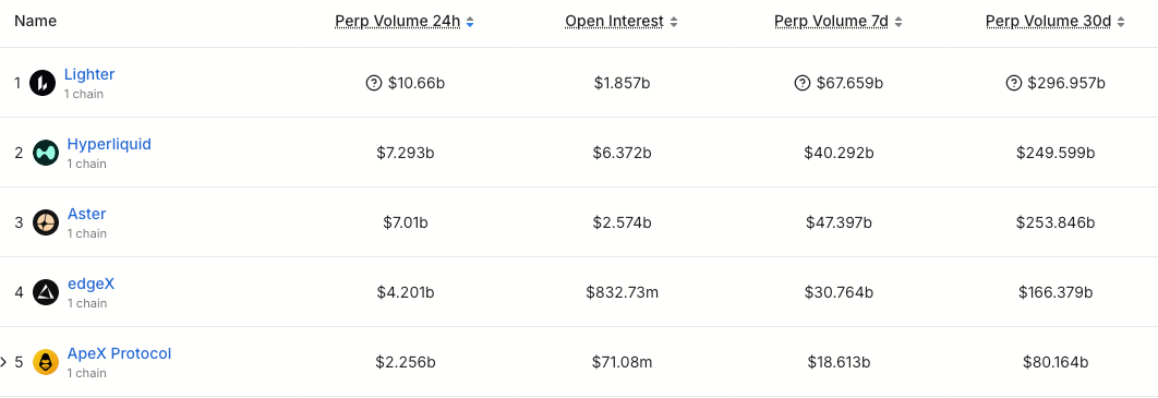 지난 30일 동안 Lighter는 2,970억 달러 의 영구 거래량 기록한 반면, Hyperliquid는 2,500억 달러를 기록했습니다. Hyperliquid의 거래량은 TradeXYZ 가 운영하는 주요 HIP-3 시장은 반영하지 않았으며, TradeXYZ를 통해 Hyperliquid 생태계의 거래량에 100억 달러가 더 추가된다는 점에 유의해야 합니다.