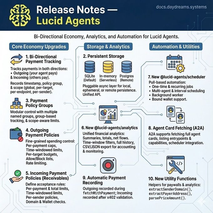 👀 루시드 에이전트가 드디어 출시되었습니다! @daydreamsagents 에이전트 팀에서 선보이는 흥미로운 기능들이 정말 많아요 (계속해서 새로운 제품들을 출시하고 있네요!).