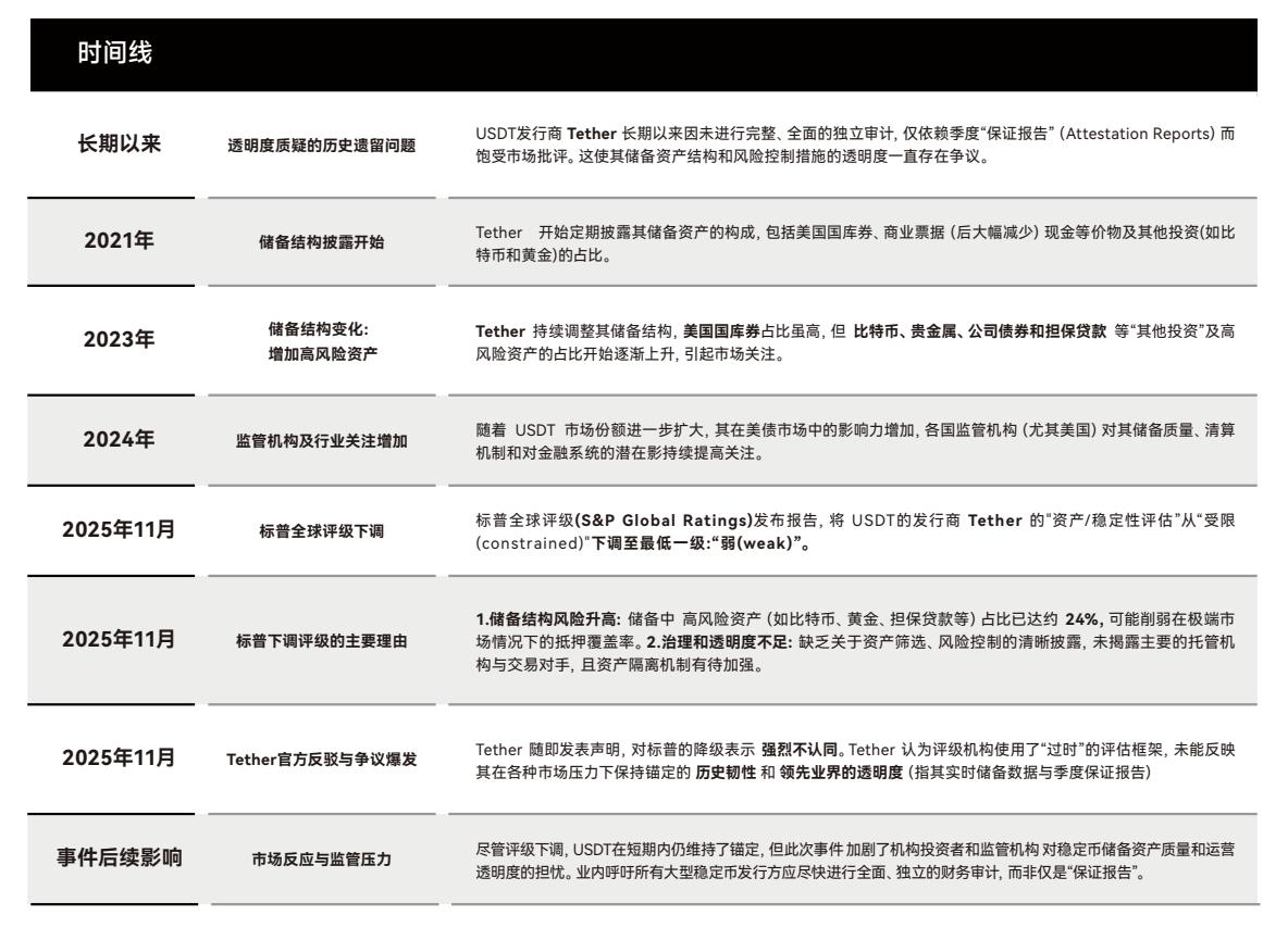 2025년 11월, S&P 글로벌은 두 가지 주요 이유를 들어 USDT의 "자산/안정성 평가"를 "제한적"에서 "약함"으로 하향 조정했습니다.