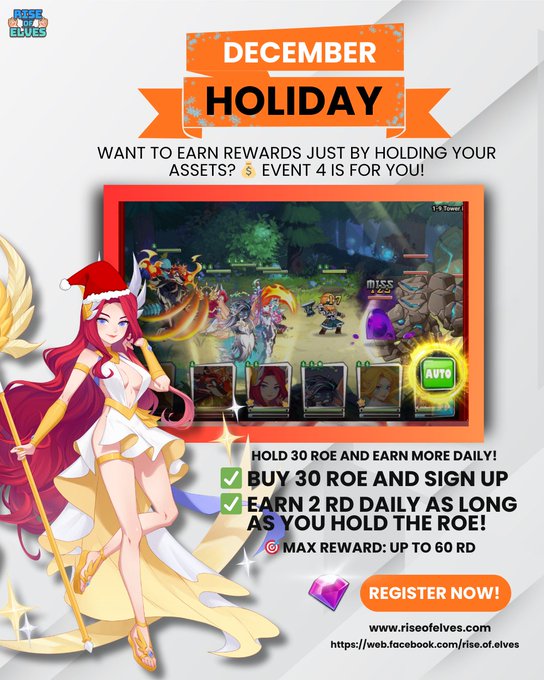 자산을 보유하는 것만으로 보상을 받고 싶으신가요? 💰 이벤트 4가 바로 당신을 위한 것입니다! ROE 30개를 보유하고 매일 더 많은 보상을 받으세요! ✅ ROE 30개를 구매하고 가입하세요. ✅ ROE를 보유하는 동안 매일 RD 2개를 획득하세요! 🎯 최대 보상: 이벤트 기간 내내 보유하면 최대 RD 60개까지 획득 가능! ✅ web.facebook.com/rise.of.elves