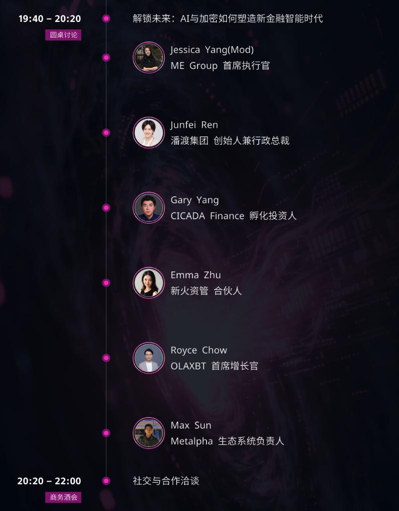 이번 비공개 회의는 엄격하고 효율적인 일정으로 진행되어 참가자 간의 심도 있고 폭넓은 의견 교환을 극대화하는 것을 목표로 합니다. 공식 등록은 18시에 시작되었으며, 핵심 의제는 18시 30분에 시작되었습니다. 앰버 그룹(Amber Group)의 공동 창립자 겸 CTO인 토마스 주(Thomas Zhu) 의 개회사를 통해 이번 회의의 전반적인 분위기를 조성했습니다. 이어서 올라 엑스비트(OlaXBT)의 창립자인 제이슨 챈(Jason Chan) 과 마인드풀니스 (Mindfulness) 의 기조 강연이 진행되었습니다 . 캐피탈의 창립 파트너인 토마스 아오 와 앰버 그룹의 웹3 가속기 투자 매니저인 패트리샤 미아오는 AI 금융 및 디지털 자산 관리에 대한 통찰력과 전략적 사고를 공유했습니다. 짧은 휴식 시간 후, ME 그룹의 CEO인 제시카 양이 사회를 맡아 참석자들이 처음으로 체계적인 토론을 할 수 있는 기회를 제공했습니다.