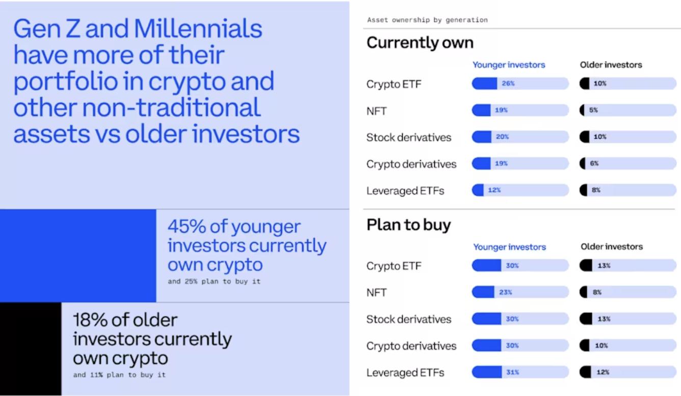 요컨대, 젊은 투자자들은 근본적인 변화를 겪었습니다. 그들은 더 자주 거래하고, 더 높은 수익을 추구하기 위해 더 높은 리스크 감수할 의향이 있으며, 암호화폐를 중심으로 한 비전통적인 투자 영역에 자산의 일정 비율을 배분할 의향이 있습니다. 동시에, 그들은 "연중무휴 24시간 운영되고, 더 폭넓은 자산 포트폴리오를 제공하며, 보다 인터넷 중심적인 경험을 제공하는" 플랫폼으로 업계를 이끌고 있습니다.