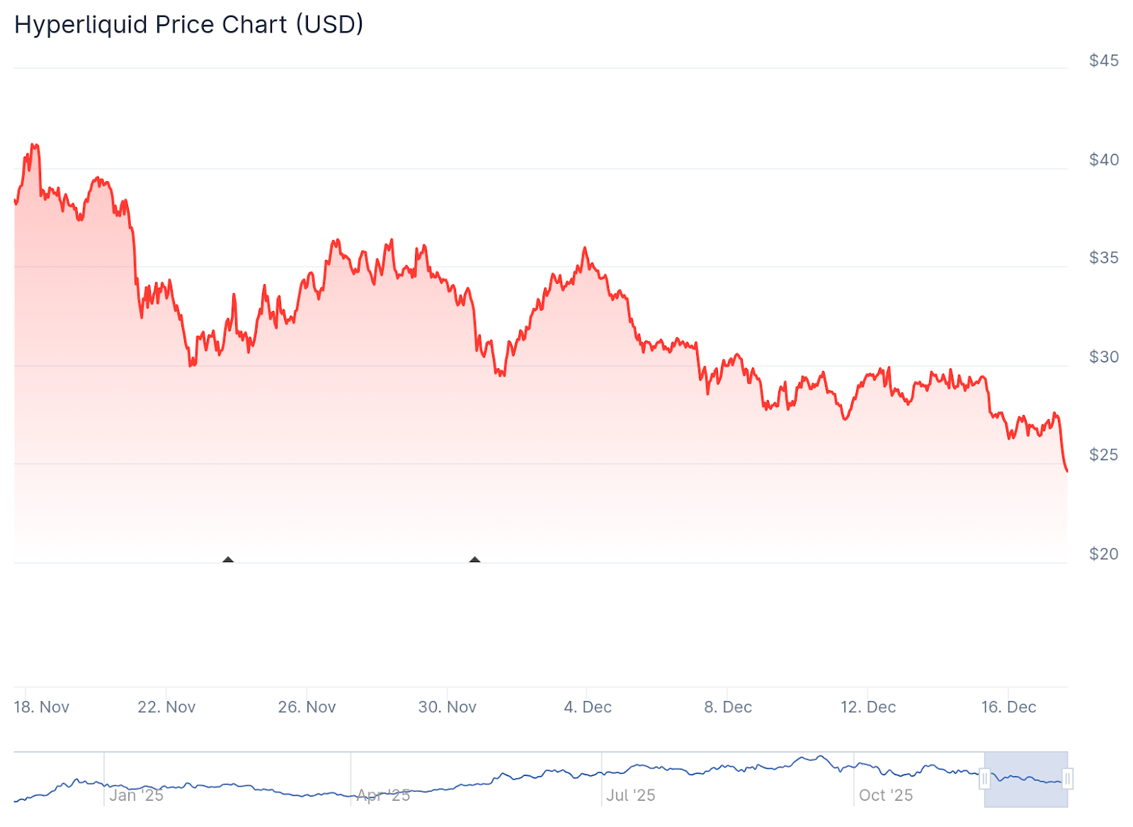 초기에 HYPE는 발표 이후 반등하여 28달러까지 치솟았지만, 곧바로 27달러 아래로 다시 떨어졌습니다. 오늘 HYPE는 다른 시장과 함께 또 한 번 큰 폭으로 하락하며 월간 손실률을 35% 까지 확대했습니다.