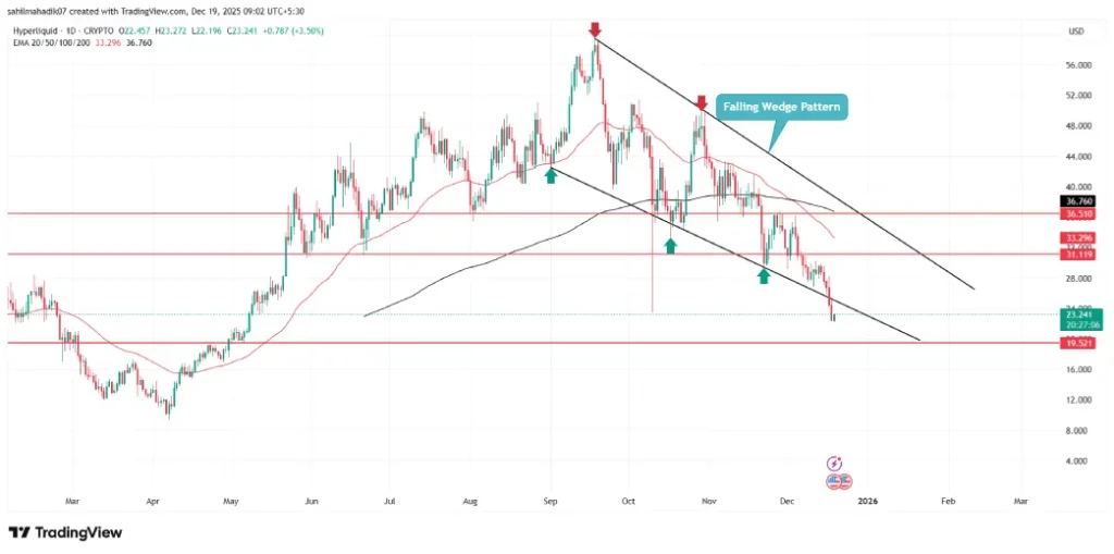 지난 주말 이후 하이퍼리퀴드(Hyperliquid) 가격은 29.9달러에서 현재 22.4달러까지 급격한 하락세를 보이며 24.9%의 손실을 기록했습니다. 대부분의 주요 암호화폐들이 비슷한 하락세를 보인 가운데, 하이퍼리퀴드는 하락 쐐기형 패턴 아래로 떨어지면서 더욱 두드러진 하락세를 나타냈습니다.