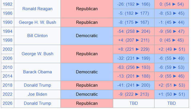- 1982년 이후 집권당은 항상 하원 의석을 잃었으며, 유일한 예외는 9·11 테러 이후인 2002년이었다.