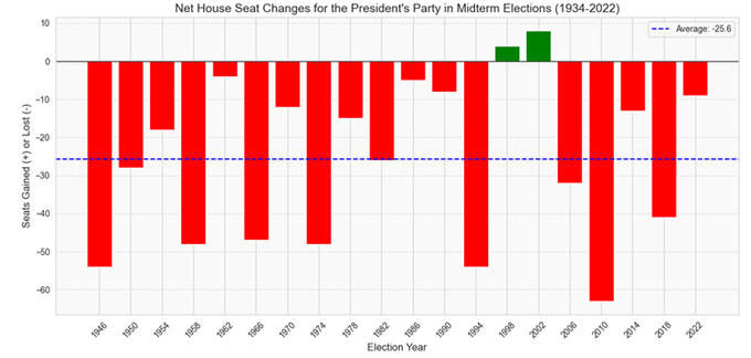 역사적으로 (제2차 세계대전 이후) 집권당은 중간선거에서 평균 25석을 잃었습니다.