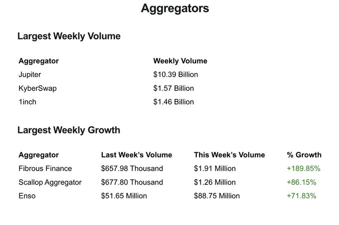 집계 플랫폼 지표 측면에서 @JupiterExchange가 주간 거래량 다시 한번 차지했으며, @KyberNetwork와 @ 1인치(1INCH) 그 뒤를 이었습니다. 가장 강력한 주간 성장세를 보인 플랫폼은 @FibrousFinance, @Scallop_io, @Ensofi_xyz로, 모두 높은 성장세를 나타냈습니다.