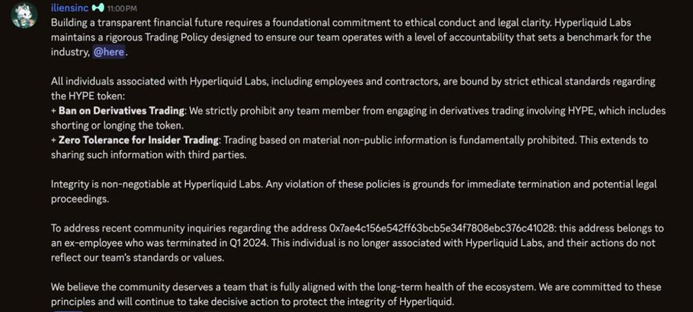 하이퍼리퀴드는 해당 지갑을 직접적으로 언급하며 "이 개인은 더 이상 하이퍼리퀴드 랩스와 관련이 없으며, 그의 행동은 우리 팀의 기준이나 가치를 반영하지 않습니다."라고 밝혔습니다.