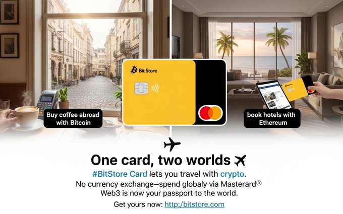 한 장의 카드로 두 세계를 경험하세요 ✈️ #BitStore 카드로 암호화폐 여행을 즐겨보세요. 해외에서 비트코인으로 커피를 구매하고, 이더리움으로 호텔을 예약하세요. 환전 없이 마스터카드를 통해 전 세계에서 사용 가능합니다. Web3는 이제 당신의 세계로 가는 여권입니다. 지금 바로 발급받으세요: http:/bitstore.com
