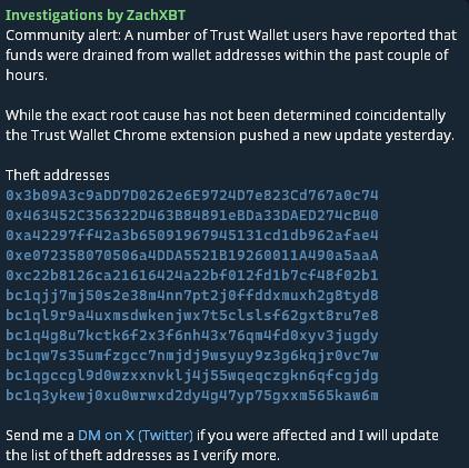 ZachXBT에 따르면 정확한 원인은 아직 미확인. 하지만 발생 시점이 우려를 낳고 있습니다. 오늘 발생한 문제는 하루 전 출시된 트러스트 월렛 크롬 확장 프로그램 업데이트 이후에 발생했습니다.