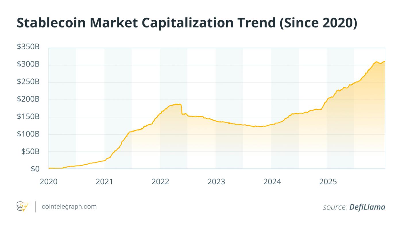 스테이블코인 시장은 1년 만에 3,100억 달러 규모로 성장했으며, 이는 암호화폐 거래 도구에서 국경 간 결제, 기관 자금, 탈중앙 금융(DeFi)을 연결하는 핵심 디지털 현금 계층으로 진화하여 암호화 자산의 주류 도입을 가속화했음을 반영합니다.