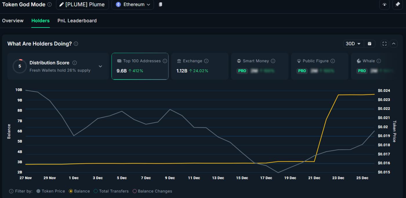 하지만 난센(Nansen) 데이터에 따르면 주목할 만한 변화가 나타났습니다. PLUME 고래 투자자들이 거의 70억 개의 PLUME을 축적했으며, 가격 또한 35% 회복하여 0.014달러에서 0.019달러로 상승했습니다.