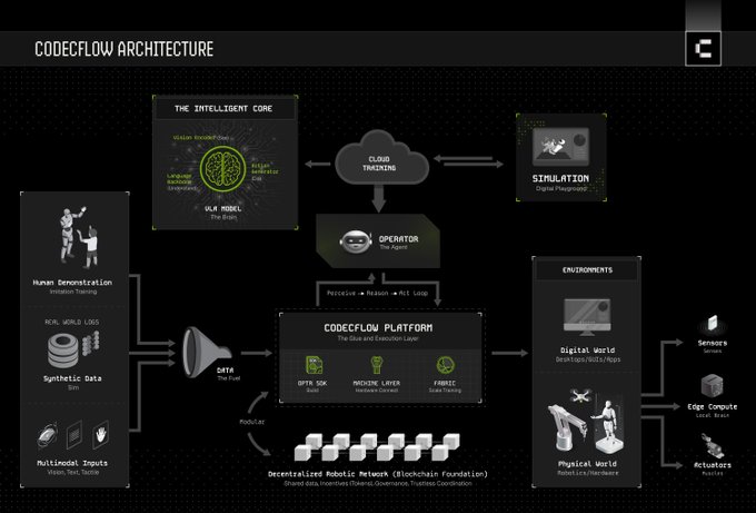 로봇 공학에서 가장 큰 병목 현상은 파편화입니다. 모든 로봇은 자체 스택, 자체 데이터 형식, 자체 제어 로직을 실행합니다. CodecFlow는 진정한 상호 운용성을 구현하여 이러한 문제를 해결합니다. 데이터, 모델, 의사 결정 및 실제 동작이 모두 연결되는 지속적인 순환 고리를 만들어냅니다.