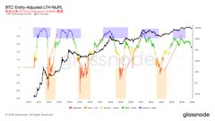 반대로 장기 투자자의 관점에서 보면 게임 영역(노란색)에 진입했지만, NUPL 데이터만 놓고 보면 강세장과 약세장 사이의 전환기(주황색)에 접어든 것으로 보입니다.
