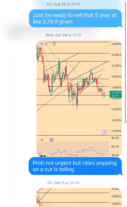 캐나다 주택 소유자 여러분께— 실내 온도 수준의 지능을 가진 주택담보대출 중개인들이 변동금리 대출이 현명한 선택이라고 당신을 설득하려 들도록 내버려 두지 마세요. 캐나다 경제는 바닥을 쳤고, 숏 이익(변동금리 유지, 40bp 스프레드 확보)과 미디엄(Medium) 적인 이익(안정적인 3/5년 고정금리 확보)을 비교하며 매달 고민하다 보면 주택담보대출 기간 동안 손해를 보게 될 것입니다. 금리가 인상될 경우 고정금리로 갈아타기에는 너무 늦을 겁니다. 첫 번째 차트에서 5년 만기 금리가 익일 금리보다 선행한다는 것을 분명히 알 수 있습니다. 중앙은행보다 앞서 나가야 합니다. 이것만 기억하세요: 변동금리 상품은 금리 인하 사이클의 바닥에서 가장 매력적이고, 고정금리 상품은 금리 인상 사이클의 정점에서 가장 매력적입니다.