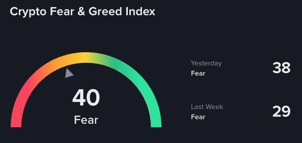 시장 심리도 개선되고 있습니다. 변동성, 거래량, 소셜 미디어 분위기, 시장 모멘텀을 종합하여 투자자 감정을 0(극도의 공포)부터 100(극도의 탐욕)까지의 척도로 측정하는 암호화폐 공포 및 탐욕 지수(Crypto Fear & Greed Index)가 지난주 29에서 오늘 40으로 상승했습니다. 이는 일반적으로 항복을 의미하는 "극도의 공포" 영역에서 분명히 벗어나고 있음을 나타냅니다.