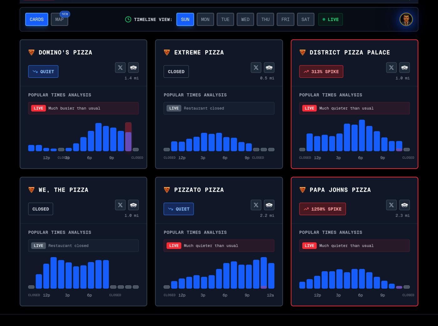 딥플로우 테크플로우( 테크 플로우 (techflowpost) TechFlow)에 따르면, 1월 5일 펜타곤 피자 워치(@pizzintwatch)는 펜타곤의 "피자 지수"가 다시 활성화되었다고 보고했습니다. "펜타곤에서 2.3마일 떨어진 파파존스 피자는 고객 방문객 수가 1250% 급증했습니다. 펜타곤에서 1.0마일 떨어진 리저널 피자 팰리스(Regional Pizza Palace) 또한 고객 방문객 수가 313% 급증하여 현재 3단계 경보가 발령된 상태입니다."