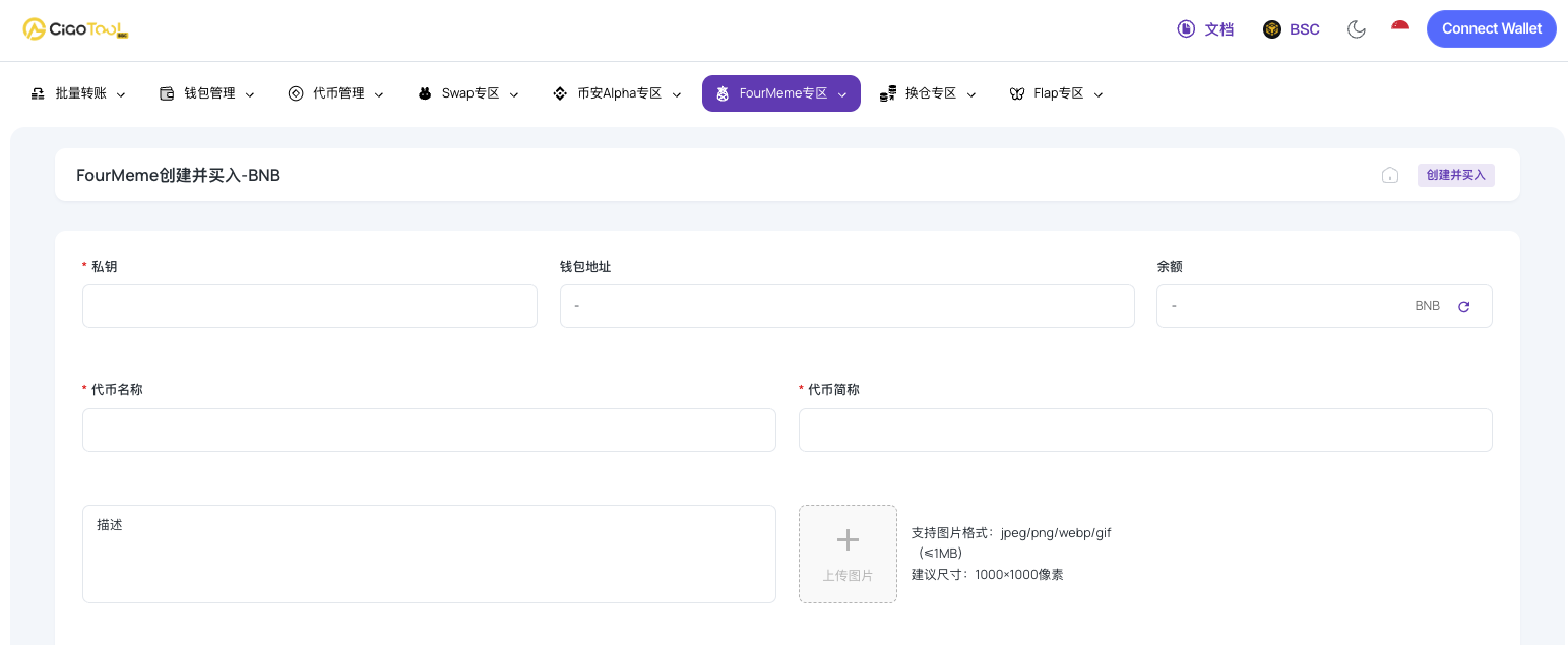 CiaoTool의 원클릭 FourMeme 생성 기능을 통해 개발자는 코딩 없이 BSC에서 토큰을 신속하게 출시하고, 여러 지갑을 통해 초기 구매 전략을 구성하고, PancakeSwap에 유동성을 추가할 수 있어 밈 프로젝트에 효율적이고 안전하며 전문적인 엔드 투 엔드 지원을 제공합니다.