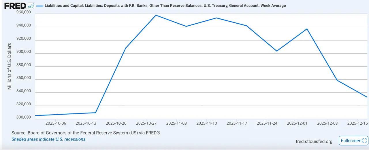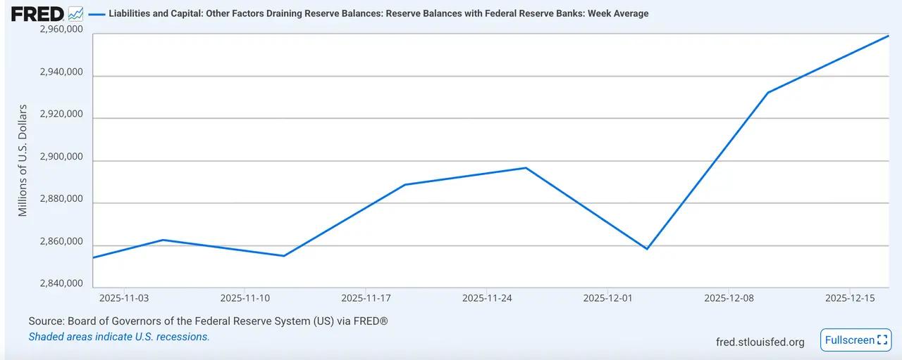 구체적으로 유동성 지표를 살펴보면, 12월 18일 기준 재무부의 TGA 계좌 잔액 861억 달러로 이전 기간보다 감소하여 시장에 자금이 공급되었습니다. 시중은행의 지급준비금은 약 2조 9400억 달러로 12월 이후 상당한 반등을 보여 은행 간 달러 유동성이 개선되었음을 나타냅니다. 주요 금리 측면에서는 SOFR-IORB 비율 또한 이전 최고치에서 하락하여 지속적인 유동성 경색 상황이 다소 완화되었음을 시사합니다.