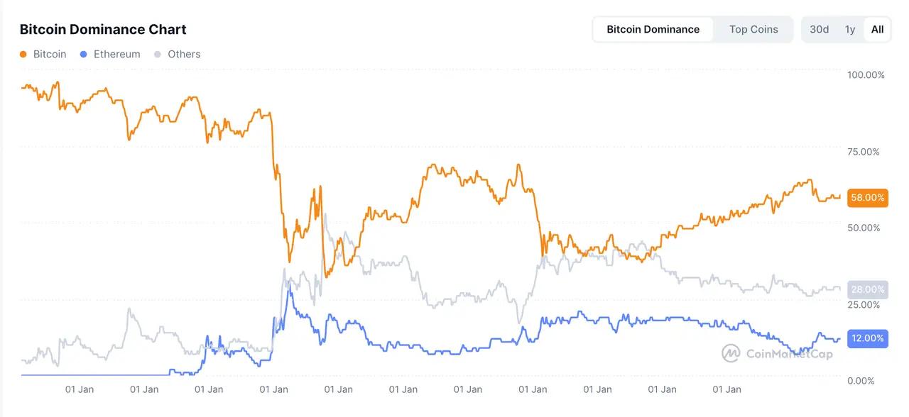 그림 2. 비트코인(BTC)과 이더리움(ETH)의 시장 점유율 변화 (CoinMarketCap 자료 기준)