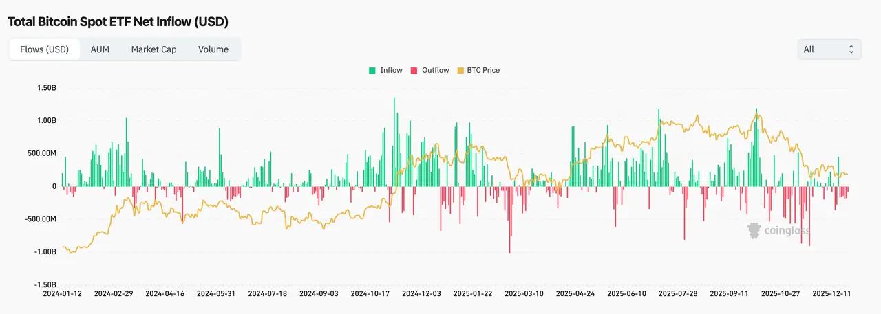 11월, 비트코인(BTC) ETF는 35억 달러의 순유출을 기록하며 해당 월의 급격한 가격 하락을 촉발했습니다. 12월 초에는 BTC ETF의 순유출 속도가 둔화되었고, 며칠 연속 소폭의 순유입이 이어졌습니다. 12월 12일 기준, 월간 순유입액은 2억 달러를 넘어섰는데, 이는 시장이 리스크 회피적인 패시브 투자에서 기관 투자자의 재분배로 전환되었음을 보여줍니다. 이더리움(ETH) ETF는 11월에 14억 달러의 순유출을 기록했지만, 12월에는 1억 2천만 달러의 순유입을 기록했습니다. 전체 순유입액은 BTC ETF보다 적었지만, 이러한 반전은 해당 범위 내에서 ETH에 대한 수요가 여전히 견고함을 보여줍니다.