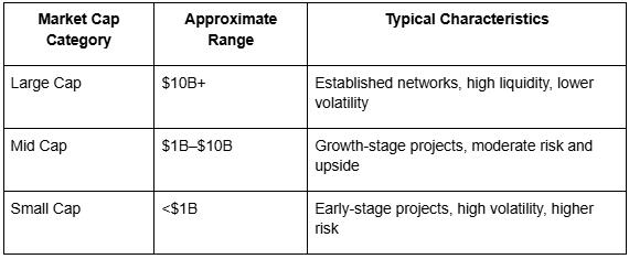예를 들어 비트코인과 이더리움은 시가총액 기준으로 시장을 장악하고 있는데, 이는 안정적인 네트워크, 유동성, 그리고 높은 사용자 채택률을 반영합니다. 중소형 코인으로 불리는 시가총액이 작은 자산들은 더 높은 성장 잠재력을 가질 수 있지만, 그만큼 더 큰 위험을 수반합니다. 투자자들은 시가총액 범주를 이해함으로써 자신의 위험 감수 수준과 투자 기간에 맞춰 포트폴리오를 조정할 수 있습니다.