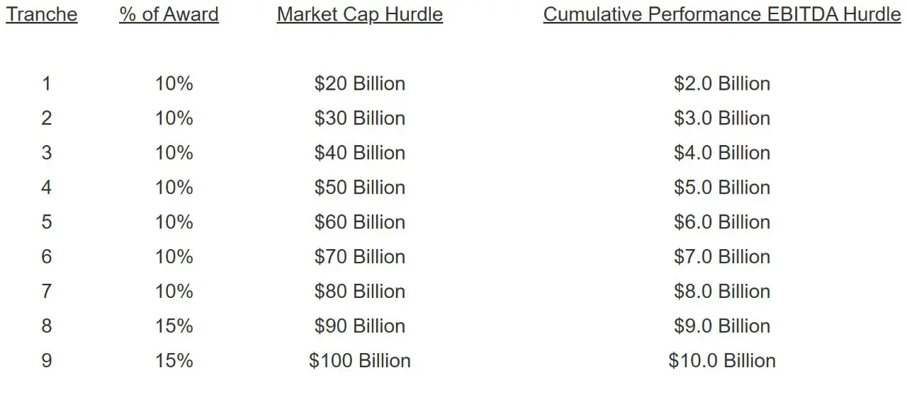 첫 번째 분할금은 회사의 시가총액이 200억 달러에 도달할 경우에만 지급됩니다. 이후 분할금은 회사의 시가총액이 100억 달러씩 증가할 때마다 지급되며, 최종적으로 1,000억 달러에 도달할 때까지 계속됩니다.