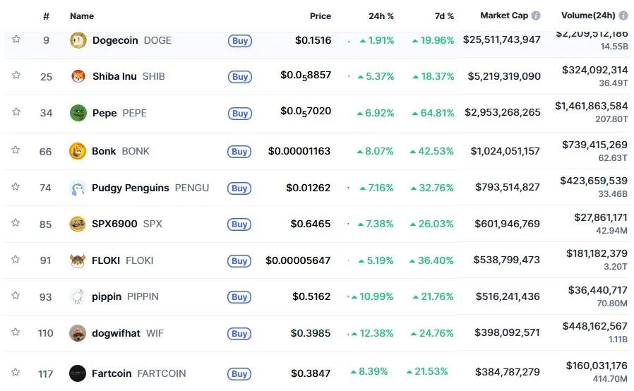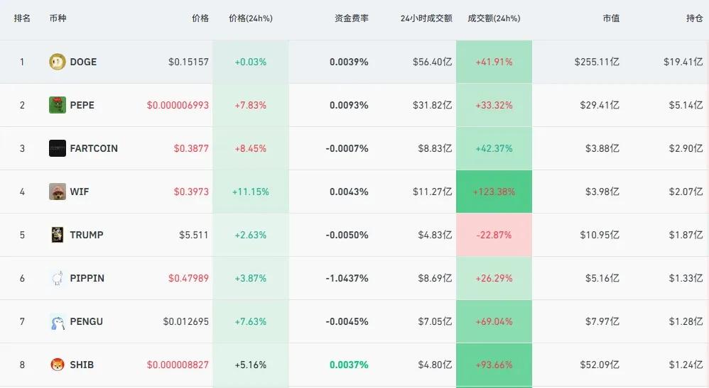 밈(meme) 코인 파생상품 시장도 빠르게 과열되고 있습니다. 코인글래스 데이터에 따르면 도지코인(Doge) 미결제약정은 지난 24시간 동안 45.41% 증가하여 19억 4,100만 달러에 달했습니다. 페페(PEPE) 33.32% 증가한 5억 1,400만 달러, 시바이누(SHIB) 93.66%, WIF는 123.39%, PENGU는 69.04% 상승했습니다.