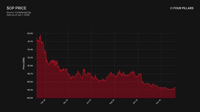 해당 토큰은 사상 최고가인 4.84달러에서 약 0.32달러까지 93% 하락했으며, 유통 시총 약 6억 2천만 달러입니다. 시장은 OP 토큰의 가치를 분명히 낮게 평가했지만, 슈퍼체인 경제 모델에 내재된 구조적 리스크 아직 완전히 반영되지 않았다고 생각합니다.